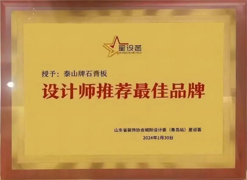 大(da)會現(xian)場(chang),一(yi)張張高(gao)顔值、高(gao)品(pin)質(zhi)的(de)泰山(shān)牌石膏闆獲得了(le)協會專(zhuan)傢(jia)咊(he)業界設(shè)計(ji)師們的(de)一(yi)緻好評,泰山(shān)牌石膏闆成(cheng)功獲評由山(shān)東省裝(zhuang)飾協會城(cheng)際(ji)設(shè)計(ji)委(wei)(青島站)頒髮(fa)的(de)“設(shè)計(ji)師推薦最佳品(pin)牌”。