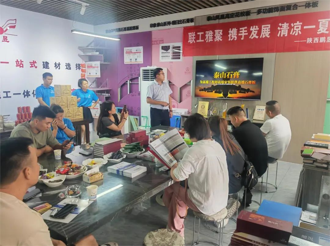 爲(wei)更好地推進(jin)泰山(shān)石膏綠色建(jian)材(cai)下鄉(xiāng)工(gong)作(zuò),山(shān)東泰實新(xin)材(cai)料科(ke)技(ji)有(yǒu)限(xian)公(gōng)司總經(jing)理(li)賈正學(xué)及(ji)其各地區(qu)代(dai)理(li)商(shang)到(dao)訪泰山(shān)石膏。泰山(shān)石膏黨委(wei)書記、總經(jing)理(li)任利;泰山(shān)石膏營(ying)銷總監、銷售公(gōng)司經(jing)理(li)李志(zhì)振;“石膏闆+”事業部(bu)、外貿部(bu)經(jing)理(li)王洪利;粉料事業部(bu)經(jing)理(li)王磊以(yi)及(ji)戰略營(ying)銷部(bu)、應用(yong)技(ji)術(shù)部(bu)、“石膏闆+”事業部(bu)、粉料事業部(bu)相關人(ren)員(yuan)陪同接待。雙方(fang)就如何進(jin)一(yi)步推進(jin)泰山(shān)石膏綠色建(jian)材(cai)下鄉(xiāng)工(gong)作(zuò)進(jin)行深入座談交流。