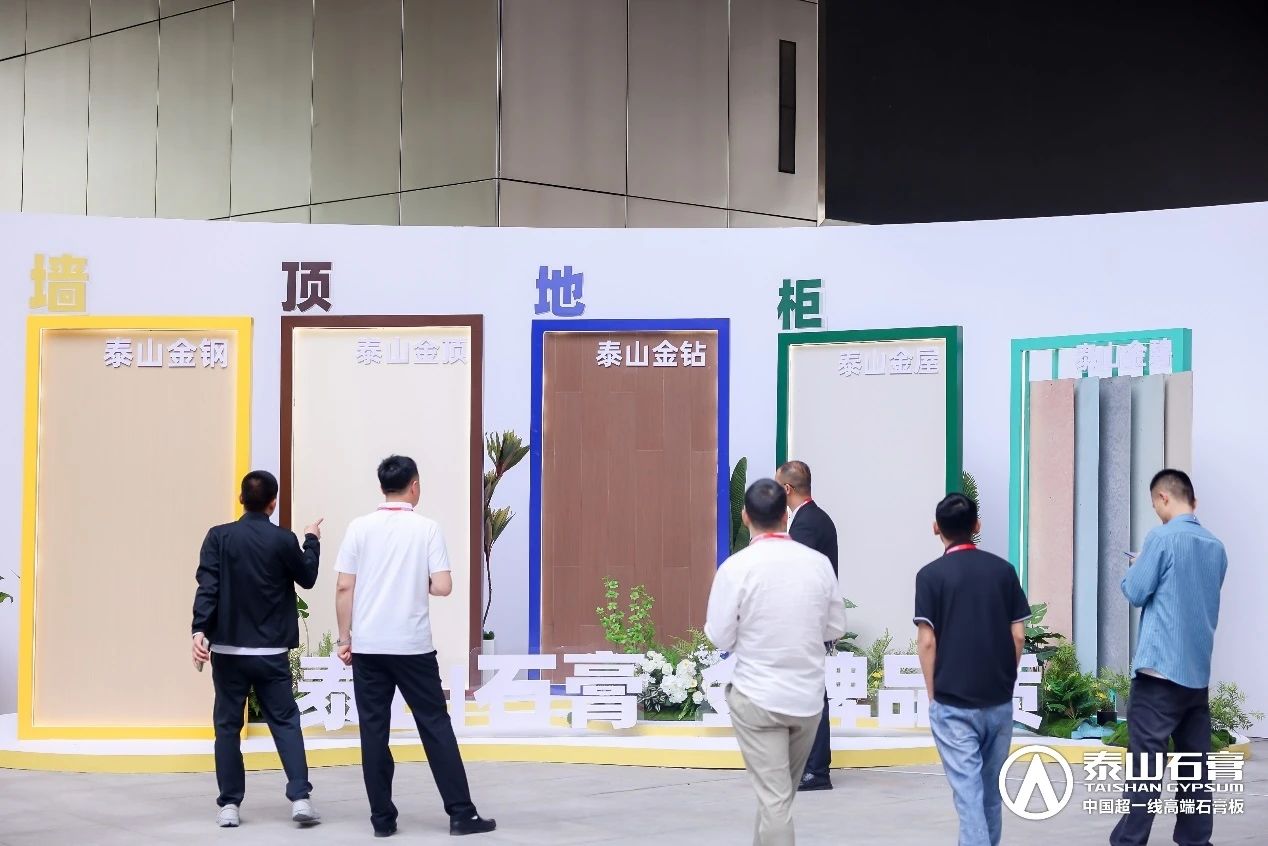 參會嘉賓們在(zai)新(xin)品(pin)展(zhan)示區(qu)現(xian)場(chang)了(le)解泰山(shān)石膏最新(xin)髮(fa)布的(de)金係(xi)列産(chan)品(pin)
