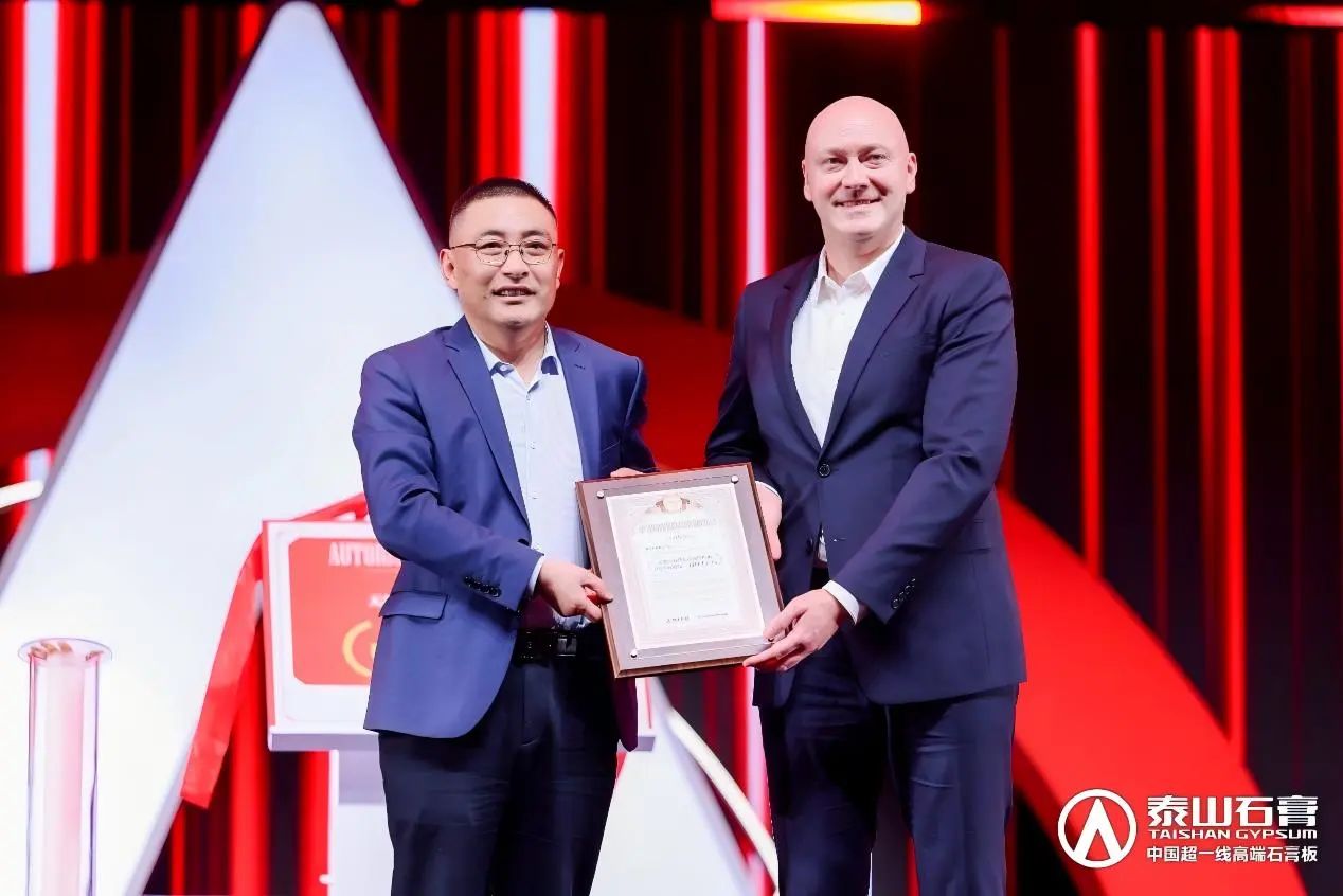 德(dé)國(guo)供應商(shang)辛北爾康普機(jī)械設(shè)備(bei)製(zhi)造(zao)有(yǒu)限(xian)責任公(gōng)司業務(wu)拓展(zhan)經(jing)理(li)大(da)衛·費舍爾爲(wei)泰山(shān)石膏頒髮(fa)“中(zhong)國(guo)市(shi)場(chang)唯一(yi)授(shou)權生(sheng)産(chan)商(shang)”榮譽證書
